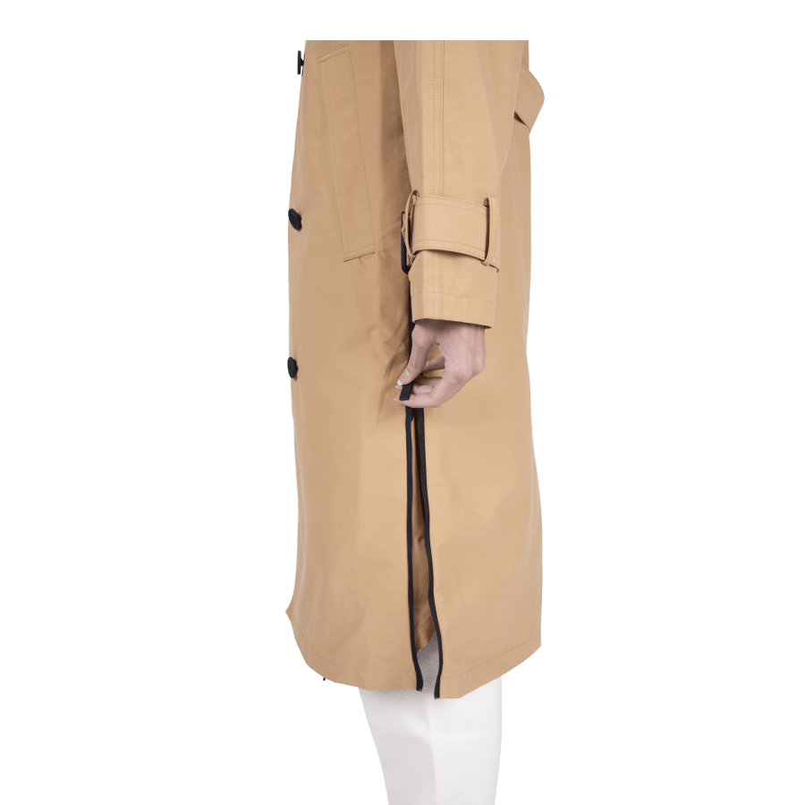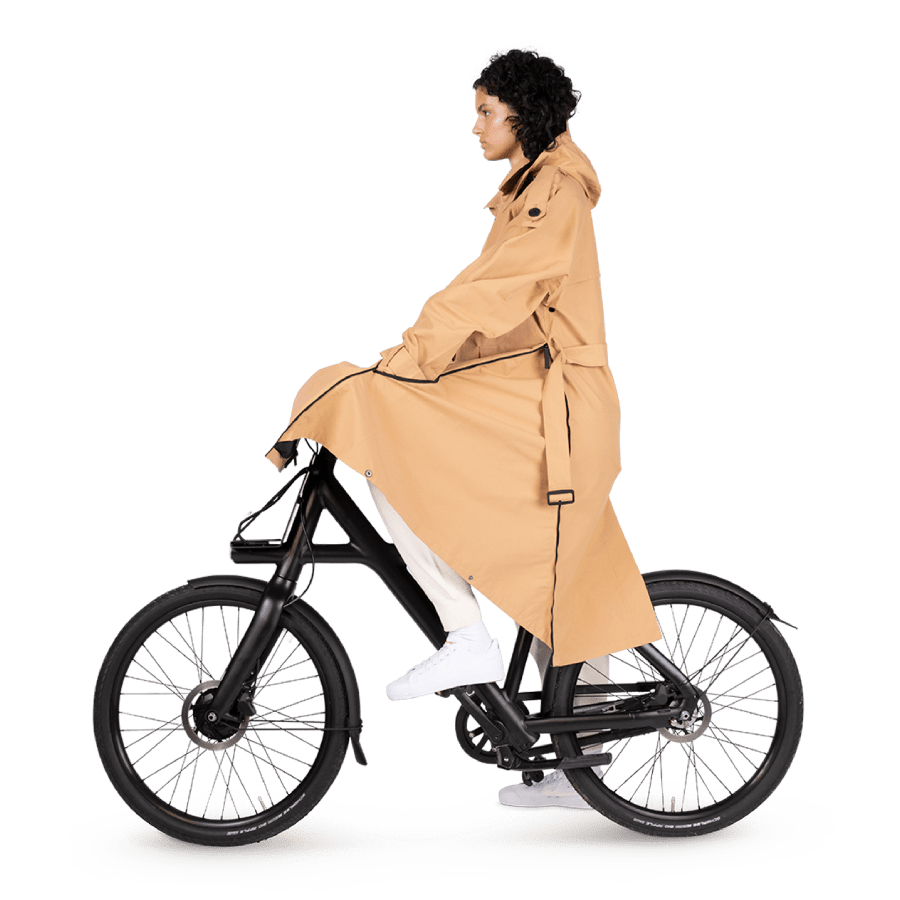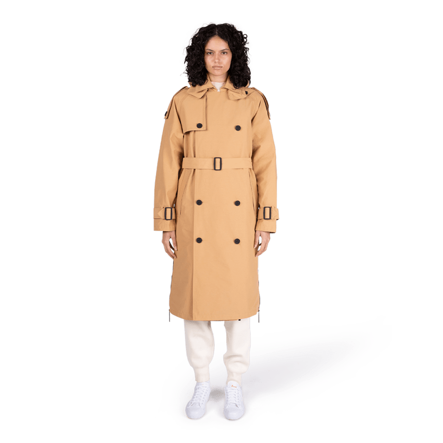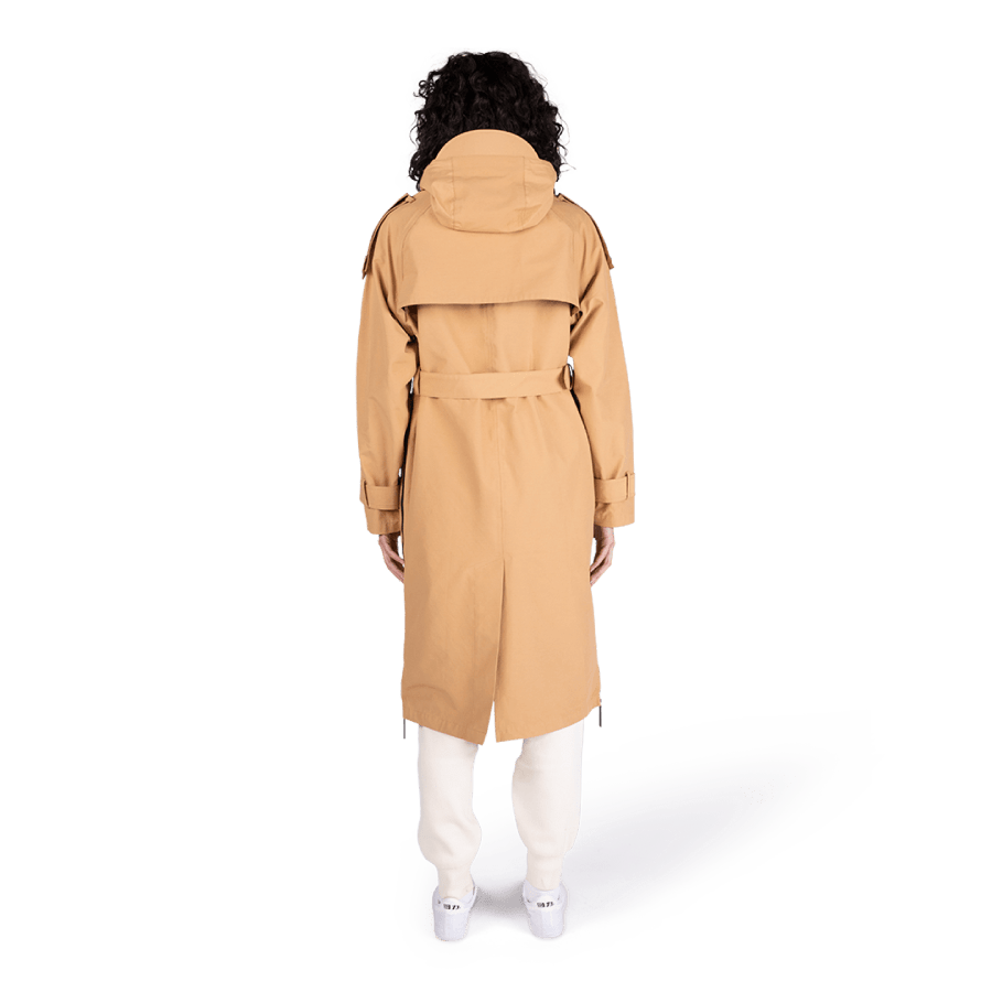 The Maium Trench Coat is a fully waterproof raincoat designed for movement. Oversized, true to its traditional silhouette, it reflects its first introduction in 1901. Easily transforms into a poncho for bike or scooter. Made from organic cotton and 111 recycled plastic bottles. Designed and tested by bad weather experts.