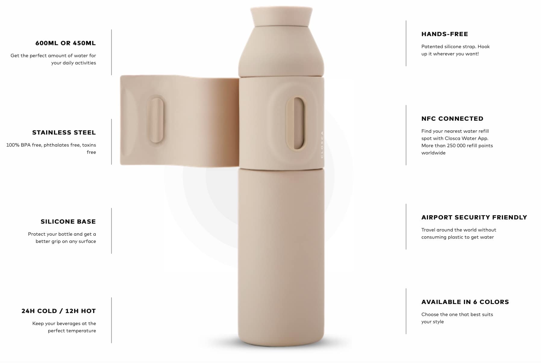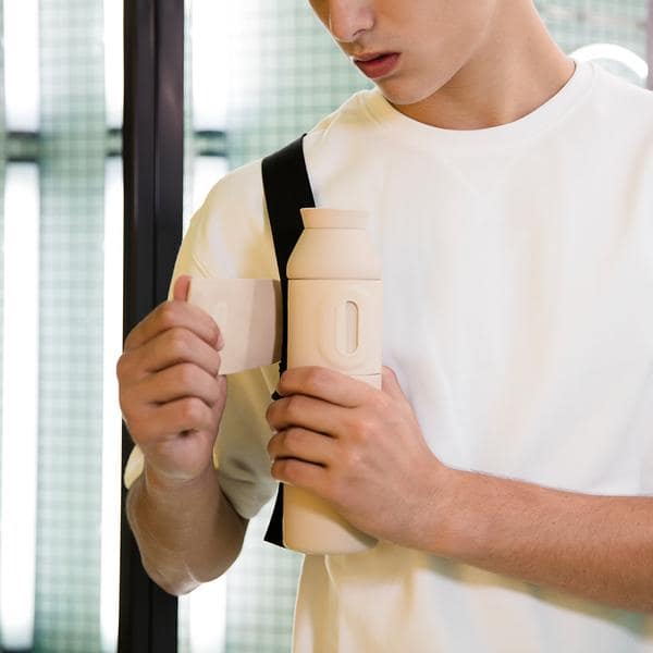 The Closca Bottle Wave is made of stainless steel, completely free of BPA, toxins and phthalates, and it does not add flavor to the water. In addition, its outer silicone coating, with our patented flap, allows the bottle to be attached to any daily accessory (handbag, backpack, baby carriage, bicycle, etc.)