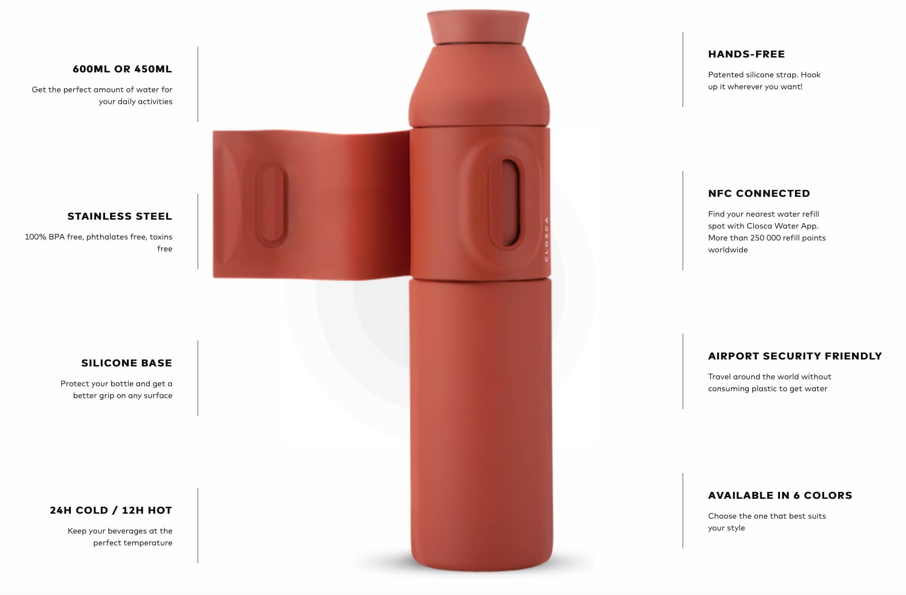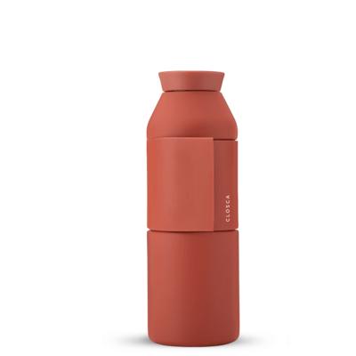 The Closca Bottle Wave is made of stainless steel, completely free of BPA, toxins and phthalates, and it does not add flavor to the water. In addition, its outer silicone coating, with our patented flap, allows the bottle to be attached to any daily accessory (handbag, backpack, baby carriage, bicycle, etc.)