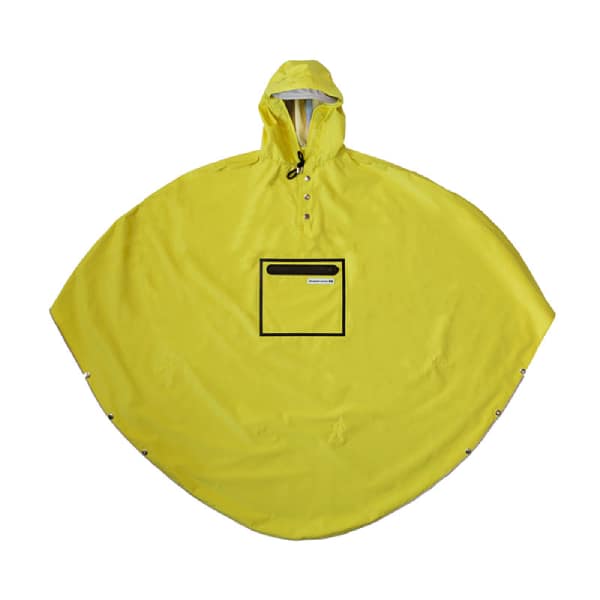 Our ponchos are made from 3 layers of hard-wearing Japanese polyester usually reserved for extreme weather conditions. Trimmed with a drawstring hood, and detailed with a waterproof zippered chest pocket, these ponchos offer safety enhancing reflective piping, side buttons to aid manoeuvrability, and internal straps to hook onto bicycle handlebars or over hands, so legs are protected from the rain if you are riding a bike. Packed into a dinky sack when out of use, this 380g rain champion is small enough to come with you on every outdoor trip!